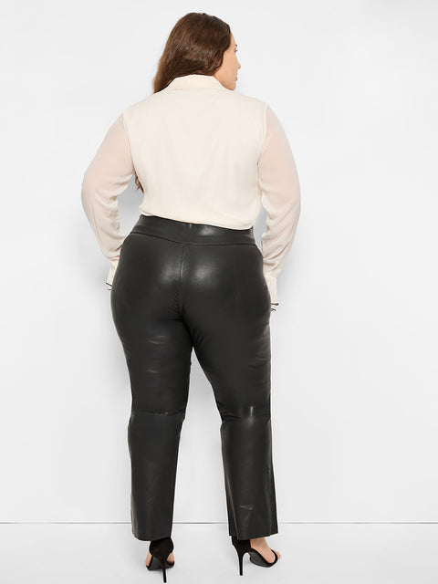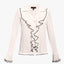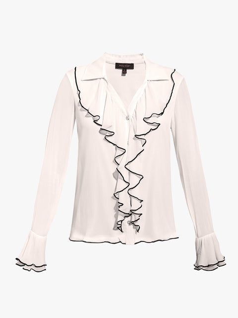 Exquisite ruffle detailing along the collar and neckline, our Nina Blouse adds a touch of romance and femineity. Ruffle sleeve cuffs bring a playful yet elegant vibe. This beauty is crafted from the softest viscose georgette and features gorgeous shell buttons down the center front collar. Pair with any of or leather bottoms and denim bottoms. Ideal for any date night or a special occasion.