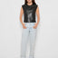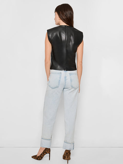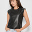 Sleek lines and padded shoulders bring edgy flair to our Blaze Recycled Leather Tee. Constructed from our signature recycled leather, Blaze features a boxy fit and drop armholes. Let yours add a touch of toughness to our Gigi Recycled Leather Leggings and Ruby Leather Wide Leg Jeans.