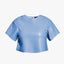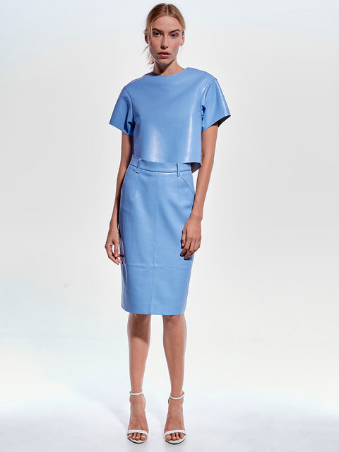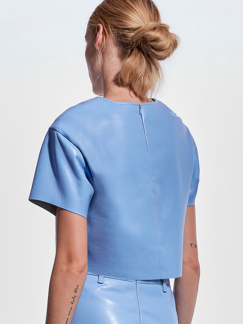 An effortlessly cool addition to your leather lineup, this boxy crop tee is the definition of street chic. Our Beck Recycled Leather Tee is cut from our signature recycled leather and features a cropped, boxy silhouette and round neckline. Pair it with our Poppy Leather Skirt for a full monochromatic look.