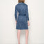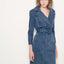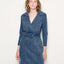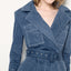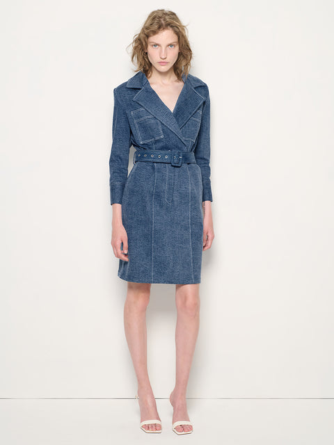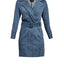 Cut in a classically structured and feminine silhouette with ¾ quarter sleeves, a fitted cut seam at the waist - the Gianna Denim dress exudes a sense of elegance. Features a notched collar lapel, contrasting white top stitch, flap pockets, self denim belt. Style the Gianna Dress with heels or boots and accessorize with any jewelry.