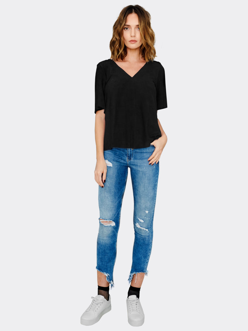 • Panneau avant et manches en cuir suédé avec jersey doux tricoté à la main sur le panneau arrière