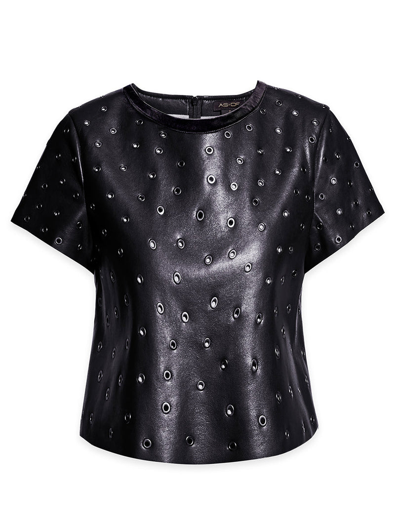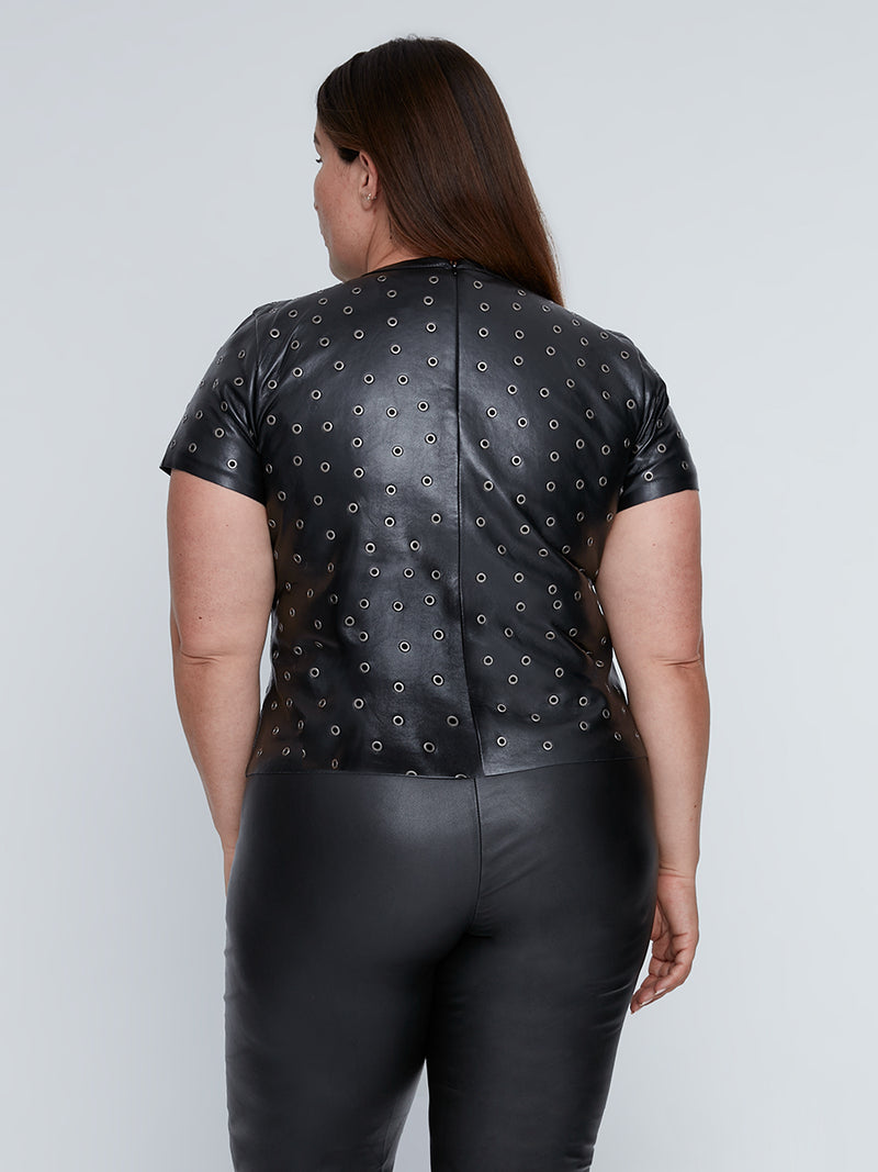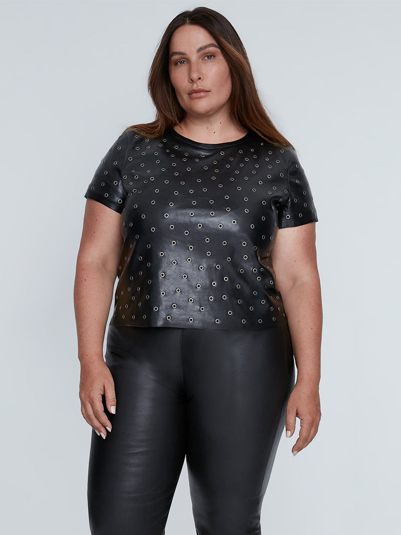 Our Jude Upcycled Leather Tee has the same well-loved fit as our classic New Guard Tee. With the length hitting at the most flattering spot, you’ll feel confident and stylish. Our upcycled leather will have you feeling good about doing your part for the Earth, and the grommets will add some edge to your wardrobe. Pair with our Robbie Stretch Leather Flares for a full look