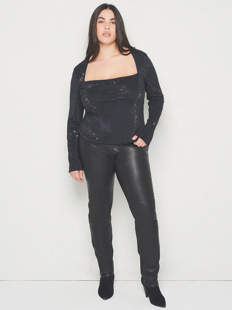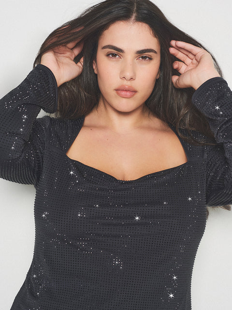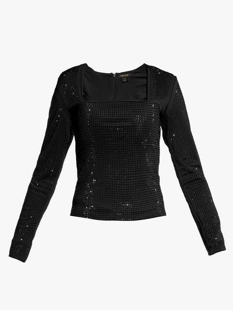 When you look this good, people take note. Our Majesty Top is fit to flatter – with a square neckline and rhinestone applique, you’ll shine at every angle. Made with our stretch knit, you’ll feel supported and secure all night. Pair with our Billie Trousers for a full look.